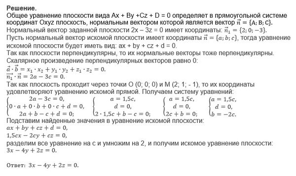 5.2.47. Составить уравнение плоскости, проходящей через начало координат и точку М (2; 1; -1) перпендикулярно плоскости 2x-3z = 0.