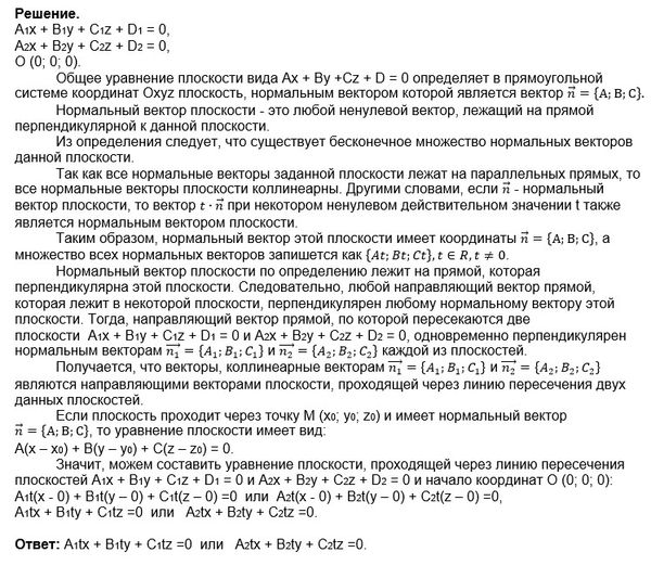 5.2.61. Составить уравнение плоскости, проходящей через линию пересечения плоскостей A1x+B1y+C1z+D1 = 0 и A2x+B2y+C2z+D2 = 0 и начало координат.