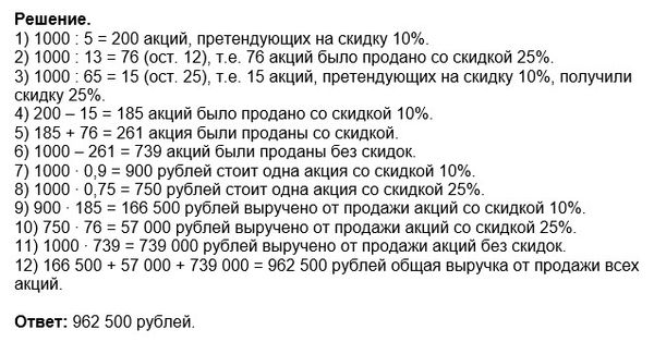 15.31. Вновь созданное акционерное общество продало населению 1000 своих акций, установив скидку 10% на каждую пятую продаваемую акцию и 25% на каждую тринадцатую продаваемую акцию. В случае, если на одну акцию выпадают обе скидки, то применяется большая из них. Найдите сумму, вырученную от продажи всех акций, если цена акции (без скидок) составляла 1000 рублей.
