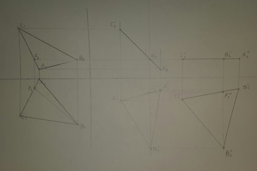 Определить натуральную величину треугольника ABC, используя метод вращения без указания положения оси.