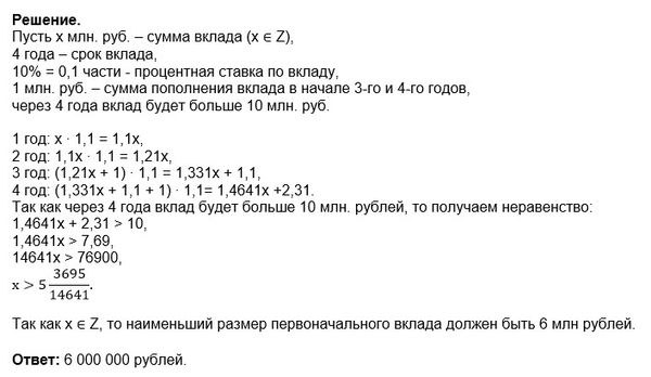 1 млн руб. Найдите наименьший размер первоначального вклада, при котором через 4 года вклад будет больше 10 млн руб.