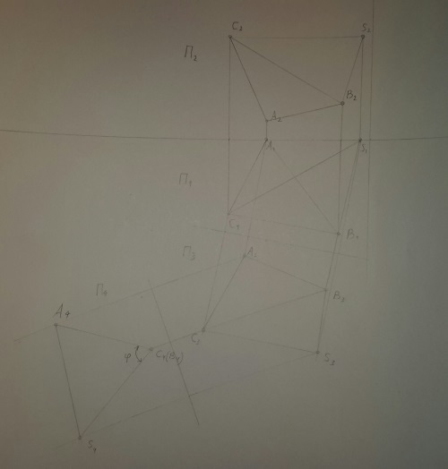 Определить угол между заданными треугольными пластинами ABC и SBC, используя метод замены плоскостей проекций.