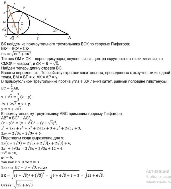 ВК^2=BC^2+CK^2=(sqrt(3)+3)^2+(sqrt(3))^2=3+6sqrt(3)+9+3=