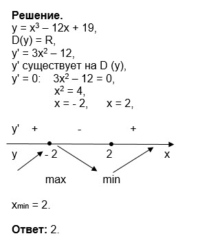 D(y)=(– ∞ ;+ ∞) y`=3x^2–12 y`=0 x^2–4=0 x^2=4 x= ± 2 Расставляем знаки производной: _+__ (–2) __–__ (2) __+__ x= 2 – точка минимума функции, так как производная меняет знак с - на + О т в е т. 2