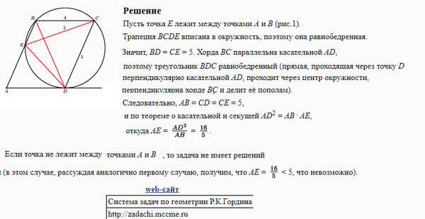 Окружность, проходящая через вершины С и D параллелограмма ABCD, касается прямой AD и пересекает прямую АВ в точках В и Е. Найдите АЕ , если AD = 4 и СЕ = 5. [9.42]