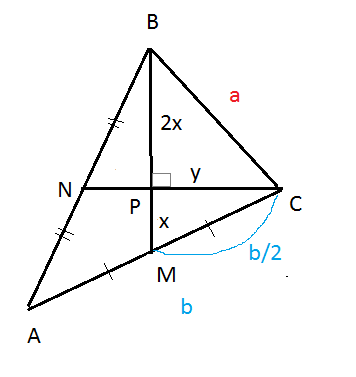 =(1/2)*3*sqrt((4a^2-b^2)/12)*sqrt(4b^2-4a^2)/12)=
