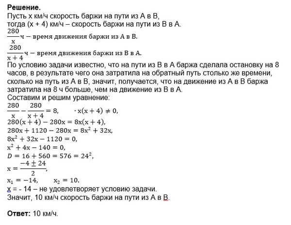 Пристани A и B расположены на озере, расстояние между ними равно 280 км. Баржа отправилась с постоянной скоростью из A в B. На следующий день после прибытия она отправилась обратно со скоростью на 4 км/ч больше прежней, сделав по пути остановку на 8 часов. В результате она затратила на обратный путь столько же времени, сколько на путь из A в B. Найдите скорость баржи на пути из A в B. Ответ дайте в км/ч.