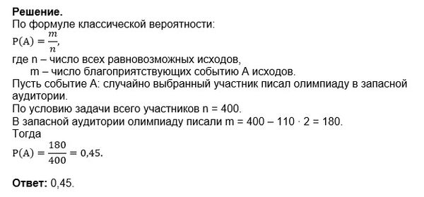 На олимпиаде по социологии 400 участников разместили в трёх аудиториях. В первых двух удалось разместить по 110 человек, оставшихся перевели в запасную аудиторию в другом корпусе. Найдите вероятность того, что случайно выбранный участник писал олимпиаду в запасной аудитории. [в8, 4]