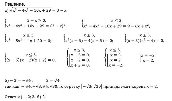а) Решить уравнение sqrt(x^3-4x^2-10x+29) = 3-x,