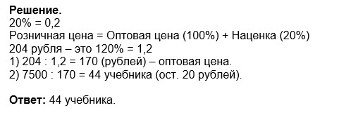 Розничная цена учебника 204 рубля, она на 20% выше оптовой цены. Какое наибольшее число таких учебников можно купить по оптовой цене на 7500 рублей? [в1-1]