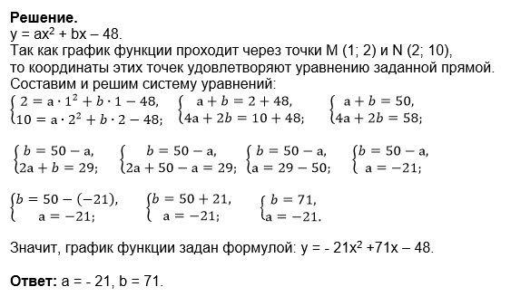 Известно, что график функции: y=ax^2+bx-48 проходит через точки M (1;2), и N(2;10). Найдите значения коэффициентов.