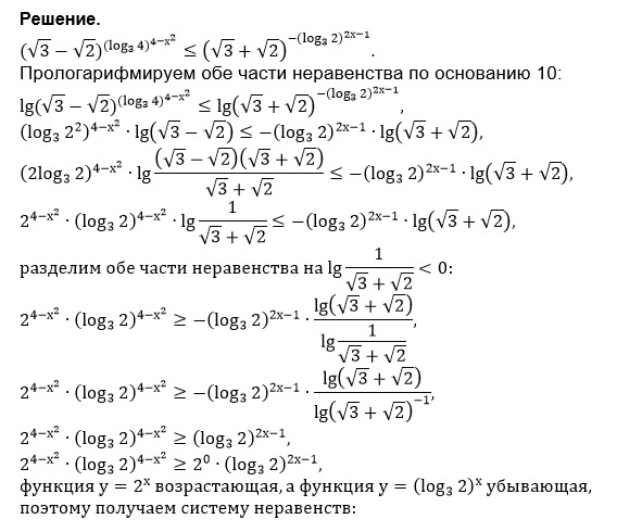 (sqrt(3)-sqrt(2))^((log34)^(4-x^2)) ≤ (sqrt(3)+sqrt(2))^(-(log32)^(2x-1)) [7.60]