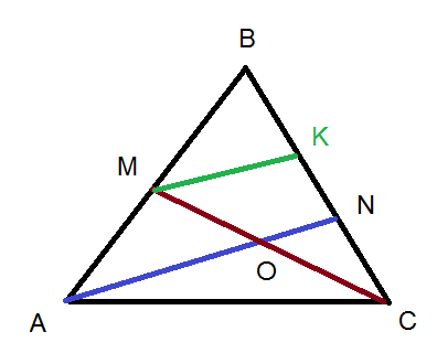 на сторонах ав и вс треугольника авс взяты соответственно точки м и n , так, что АМ:МВ=2:3, BN:NC=2:1. Отрезки AN и СМ пересекаются в точке О. Найти отношение СО:ОМ.