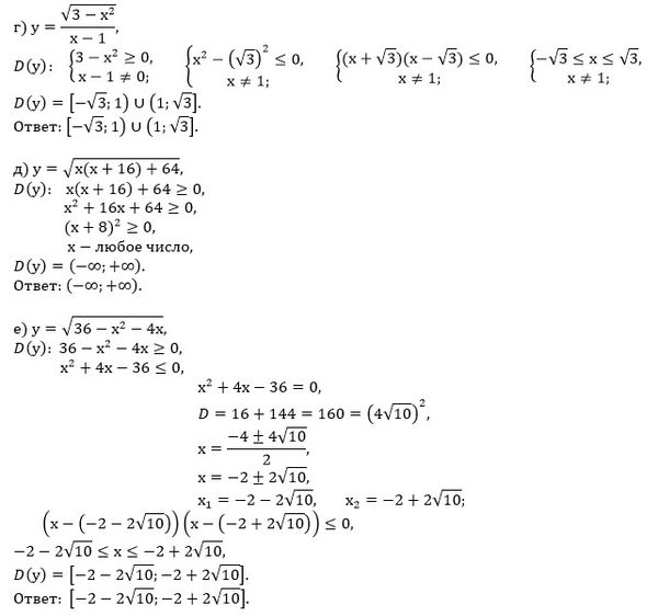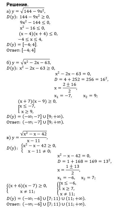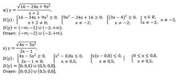 Найдите область определения функции, заданной формулой: а) y= sqrt(144-9x^2); б) y= sqrt( x^2-2x-63); в) y= sqrt(x^2-x-42)/(x-11); г) y= sqrt(3-x^2)/(x-1);д) y= sqrt(x(x+16)+64); е) y= sqrt(36-x^2-4x); ж) y= sqrt(16-24x+9x^2)/(x+2); з) y= sqrt(4x-5x^2)/(2x-1).