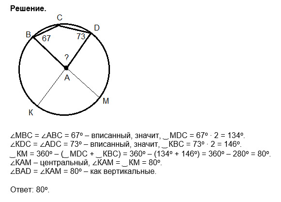 Вершина A выпуклого четырёхугольника ABCD является центром окружности, проходящей через точки B, C и D. Найдите угол BAD , если уголы ABC и ADC равны соответсвенно 67° и 73°.