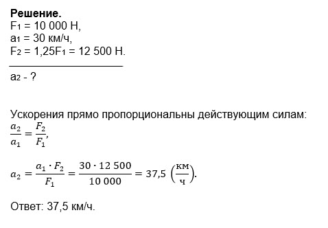 Машина при силе двигателя 10000 Н имеет ускорение 30 км/ч.Какое ускорение будет иметь машина, если силу увеличить на 25%?