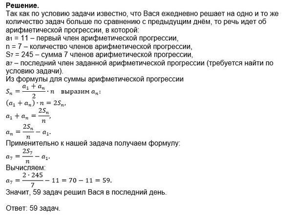 Васе надо решить 245 задач. Ежедневно он решает на одно и тоже количество задач больше по сравнению с предыдущим днём. Известно, что за первый день Вася решил 11 задач. Определите, сколько задач решил Вася в последний день, если со всеми задачами он справился за 7 дней