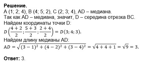 Находим координаты точки D - середины BC x_(D)=(x_(B)+x_(C))/2=(4+2)/2=3 y_(D)=(y_(B)+y_(C))/2=(5+3)/2=4 z_(D)=(z_(B)+z_(C))/2=(2+4)/2=3 AD=sqrt((x_(D)-x_(A))^2+(y_(D)-y_(A))^2+(z_(D)-z_(A))^2)= =sqrt((3-1)^2+(4-2)^2+(3-4)^2)=sqrt(4+4+1)=sqrt(9)=3 О т в е т. 3