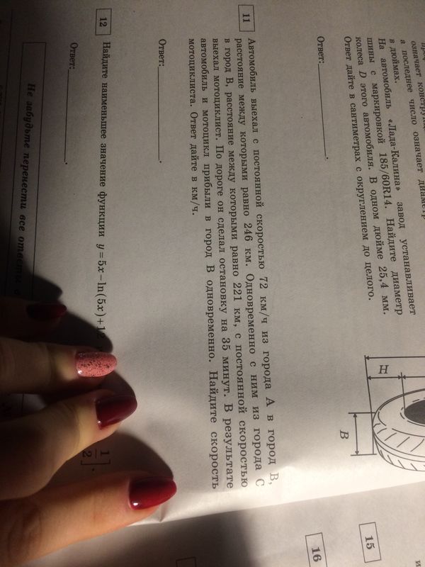 11. Автомобиль выехал с постоянной скоростью 72 км/ч из города A в город B. Расстояние между которыми равно 246 км