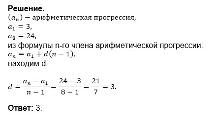 Между числами 3 и 24 поместить шесть чисел, чтобы все эти восемь чисел образовали арифметическую прогрессию. В ответе указать разность прогрессии.