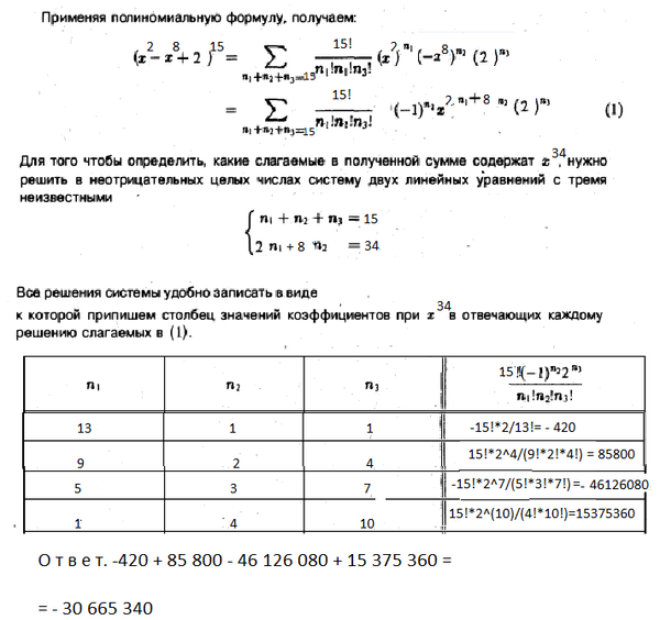 Найти коэффициент при x^34 в разложении данного выражения (x^2-x^8+2)^15 по полиномиальной формуле, полученной после раскрытия скобок и приведения подобных членов.