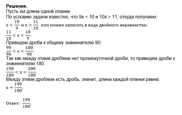 Общая длина девяти одинаковых планок меньше 10 м а 10 планок по длине больше 11 м какова длина каждой планки шестой класс