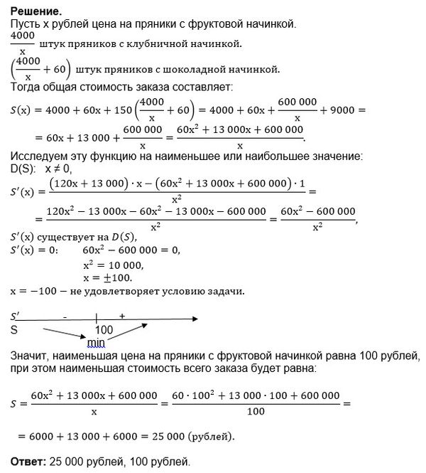f(40)= 4000 + (4000/40)*60+150*(40+60) =25 000 руб - наименьшая стоимость заказа, при этом цена пряников с фруктовой начинкой равна 4000/40=100 руб.