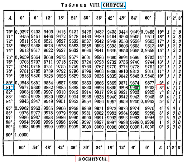 Найти синус или косинус угла, например, 3^(o)42` А можно наоборот, зная значение - найти угол. На первом приложении находим в таблице число 0,99 и в правой колонке угол, косинус которого равен 0,99. Это 8^(o). В левой колонке угол, синус которого равен 0,99. Это 81^(o)+60`=82^(o)