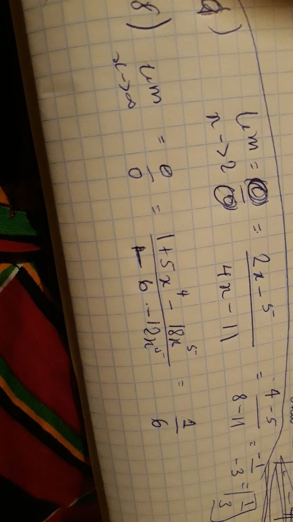 б)=( ∞ / ∞ )=lim_(x→ ∞)((1/x^5)+(1/x)-3)/((1/x^6)-(6/x^5)-2) =3/2