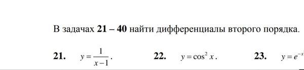 21 y`=((x-1)^(-1))= -1*(x-1)^(-2) ( формула 1) y``=(y`)`=-1*(-2)*(x-1)^(-3)=2/(x-1)^3 ( формула 1) d^(2)y=y``(x)*dx^(2) О т в е т. d^(2)y=(2/(x-1)^3)*dx^(2)