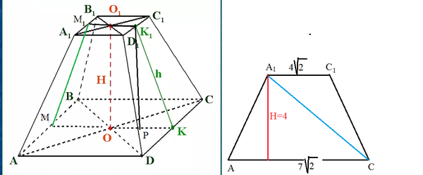 Диагональное сечение A1C1CA - равнобедренная трапеция с высотой H=4