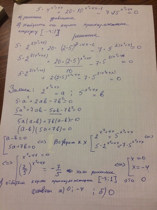 а) 5*4^(x^2+4x)+20*10^(x^2+4x-1)-7*25^(x^2+4x)=0 решите уравнение б) Найдите все корни этого уравнения, принадлежащие отрезку [-3;1]