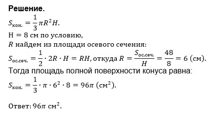 высота конуса 8 см а площадь осевого сечения 48 см2. узнать площадь полной поверхности конуса.