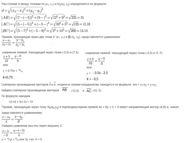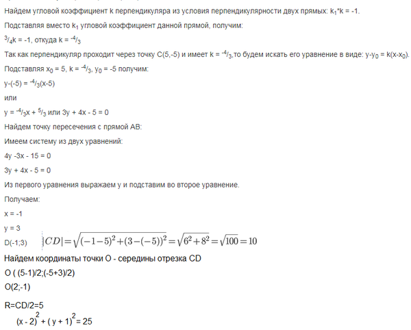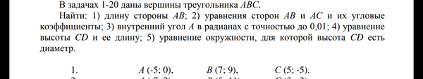 Найти: 1) длину стороны АВ\ 2) уравнения сторон АВ и АС и их угловые коэффициенты; 3) внутренний угол А в радианах с точностью до 0,01; 4) уравнение высоты CD и ее длину; 5) уравнение окружности, для которой высота CD есть диаметр.