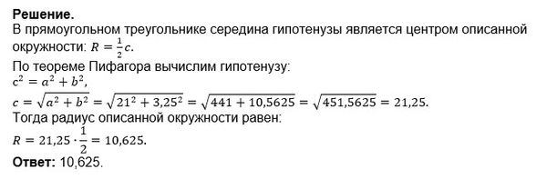 В прямоугольном треугольнике известны длины катетов, равные 21 и 3,25. Вычислить радиус круга, описанного около треугольника.