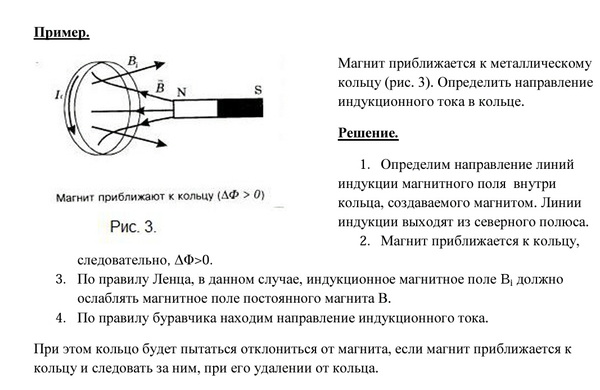 Согласно правилу Ленца, индукционный ток в контуре имеет такое направление, что создаваемое этим током магнитное поле препятствует тем изменениям магнитного потока через контур, которые вызывают появление индукционного тока. Направление вектора индукции магнитного поля, вызывающего появление ЭДС индукции. При вдвигании магнита магнитный поток возрастает. По правилу Ленца индукционный ток в кольце должен создать магнитное поле, вектор индукции которого имеет противоположное направление. Такому направлению вектора индукции соответствует направление тока в кольце (определено при помощи правила буравчика).