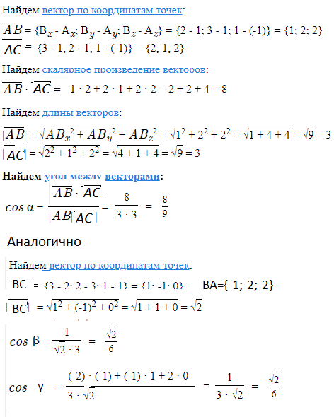 В трегольнике АВС вершины имеют координаты А(1;1;-1) В(2;3;1) С(3;2;1) Найти: 1)длины сторон 1)внутренние углы 2)острый угол между медианой ВD и стороной АС