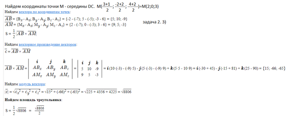 2. Вершины пирамиды находятся в точках A(-7 ,-5,6), В(-2,5,-3), С(3,—2,4), D(1,2,2). Вычислить: 1) площадь грани BCD, 2) площадь сечения, проходящего через середину ребра CD и две вершины пирамиды А и B, 3) объем пирамиды.
