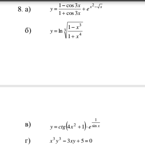 y`=((1-cos3x)`*(1+cos3x)-(1-cos3x)*(1+cos3x)`)/(1+cos3x)^2 + e^(x^2-sqrt(x))*(x^2-sqrt(x))`=