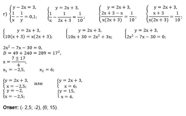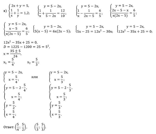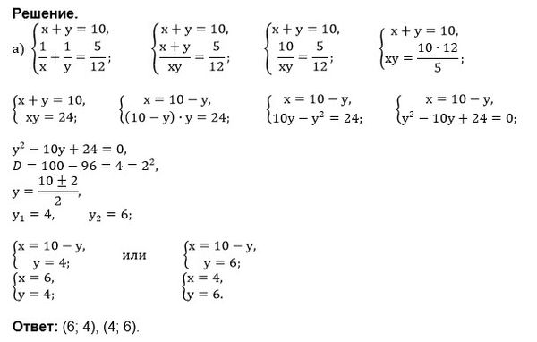 Решите систему уравнений: а) x+y=10; (1)/(x)+(1)/(y)=5/12; б) x-y=6; (1)/(y)-(1)/(x)=3/20; в) 2x+y=5; (1)/(x)+(1)/(y)=1.2; г) y-2x=3; (1)/(x)-(1)/(y)=0.1.