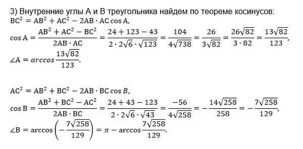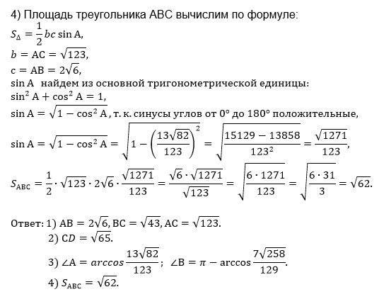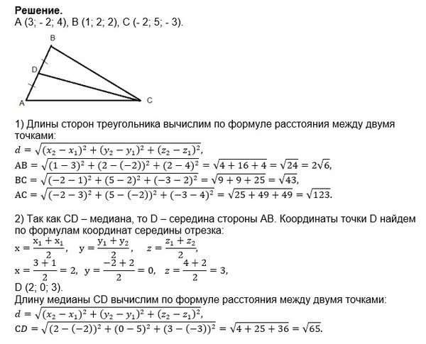 Даны вершины треугольника ABC , определить: 1)длины сторон треугольника 2)длину медианы CD 3) Внутренний угол при вершинах A и B 4)Площадь треугольника ABC A(3,-2,4) B(1,2,2) C(-2,5,-3)