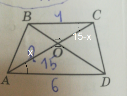 Треугольники ВОС и AOD подобны по двум углам: ∠ВСА= ∠СAD - внутренние накрест лежащие ∠ВОС= ∠AOD - вертикальные Из подобия x:(15-x)=6:4 4x=6*(15-x) 4x=90-6x 10x=90 x=9 О т в е т. 9