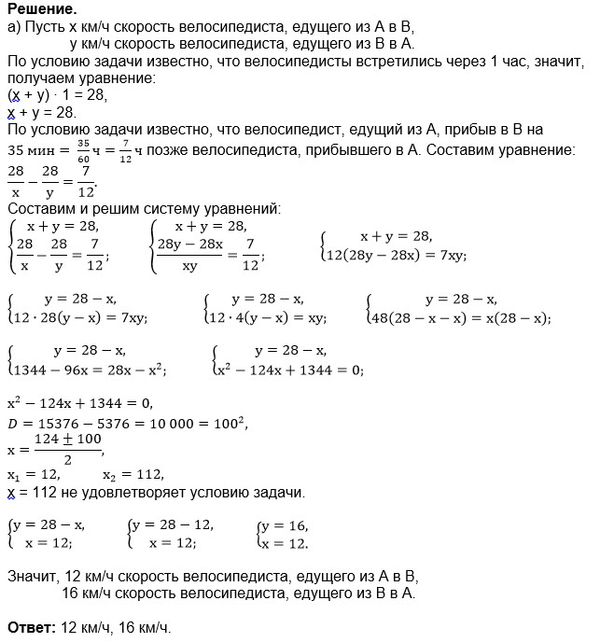 а) Два велосипедиста выехали одновременно из пунктов А и В, расстояние между которыми 28 км., и встретились через час. С какой скоростью двигался каждый велосипедист, если один прибыл в пункт В на 35 мин. позже, чем другой в пункт А?
