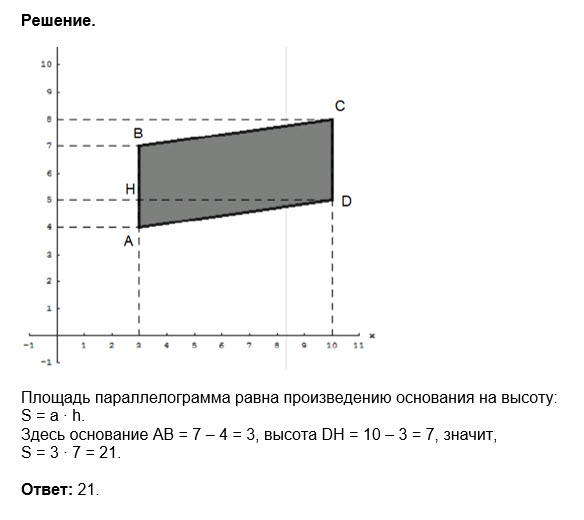 Найдите площадь параллелограмма, вершины которого имеют координаты (3;4), (10;5), (10;8), (3;7).