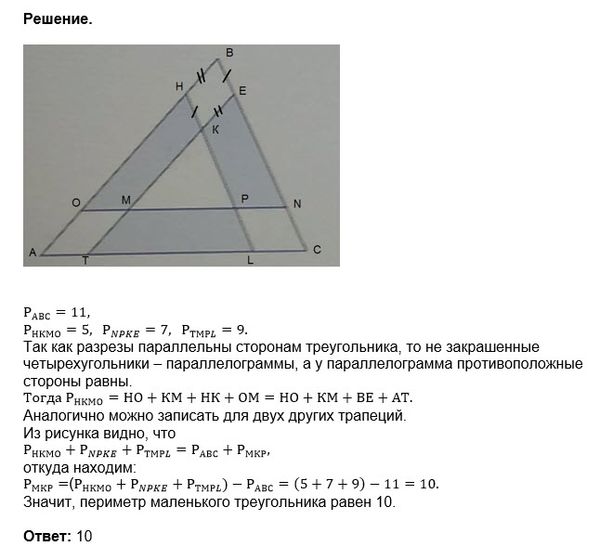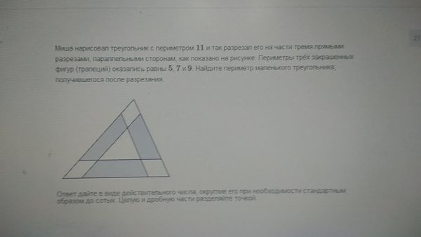 Миша нарисовал треугольник с периметром 11 и так разрезал его на части тремя прямыми разрезами, параллельными сторонам, как показано на рисунке. Периметры трех закрашенных фигур (трапеций) оказались равны 5, 7 и 9. Найдите периметр маленького треугольника, получившегося после разрезания.