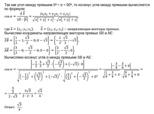 В правильной шестиугольной пирамиде SABCDEF, стороны оснований которой равны 1, а боковые рёбра равны 2, найдите косинус угла между прямыми SB и АЕ.