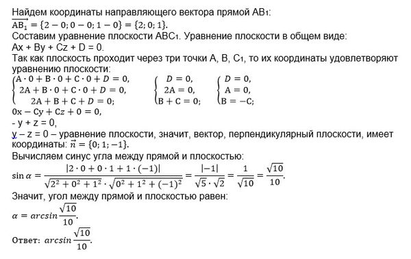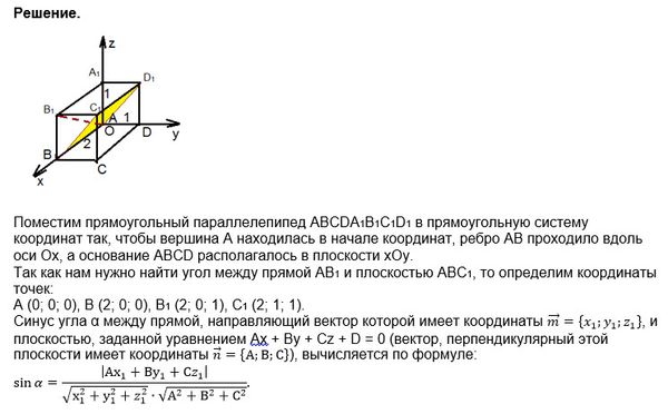 В прямоугольном параллелепипеде ABCDA1B1C1D1, АВ = 2, AD = АА1 = 1. Найдите угол между прямой АВ1 и плоскостью АВС1.