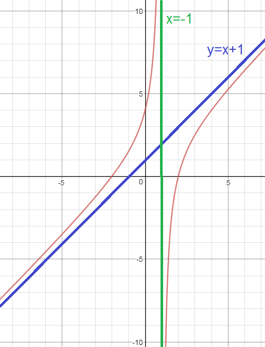 О т в е т. x=1 - вертикальная асимптота; у=х+1 - наклонная асимптота ( см. рис.)
