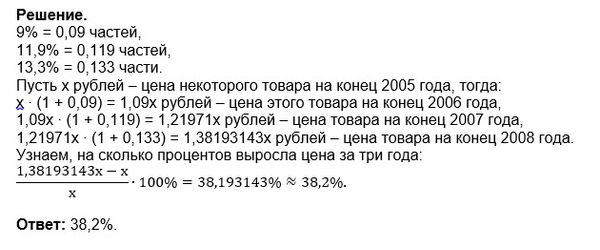 "Инфляция за последние годы:2006-9%,2007-11,9%,2008-13,3%"(из газет). На сколько процентов выросли цены за три указанных года?