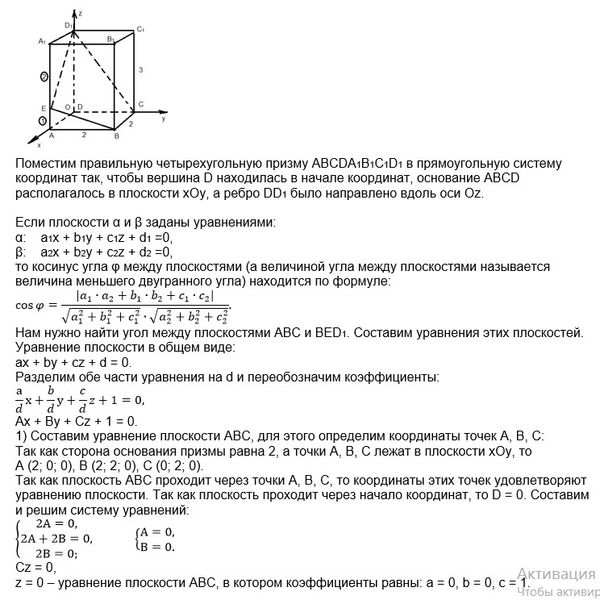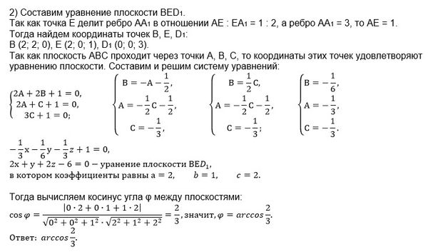 В правильной четырехугольной призме ABCDA1B1C1 стороны основания равны 2, а боковые рёбра равны 3. На ребре АА1 отмечена точка Е так, что АЕ: ЕА1 =1:2. Найдите угол между плоскостями АВС и BED1.